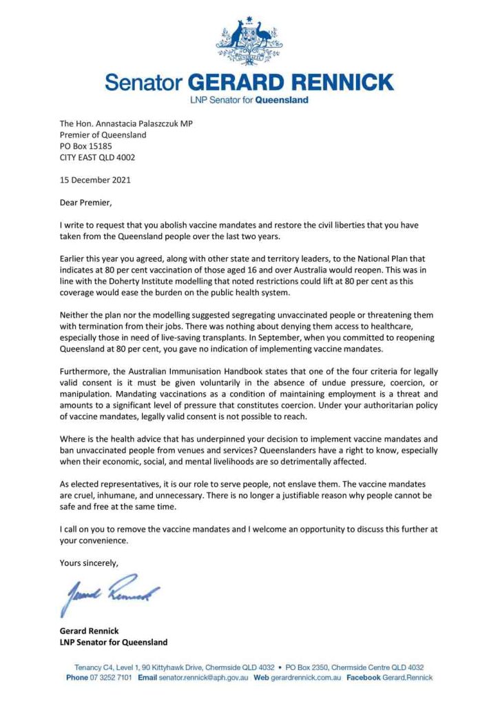 My letter to the Queensland Premier requesting that she abolish vaccine mandates and restore civil liberties