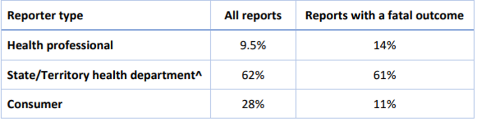 This provides information on the reporter type for adverse event reports for COVID-19 vaccines received up to 6 March 2022: All adverse event reports, including those with a fatal outcome, remain in the Therapeutic Goods Administration (TGA) database even if they have not been assessed as vaccine related so that they are included in analyses to detect safety signals based on patterns of reporting. The TGA encourages consumers and health professionals to report suspected side effects, even if there is only a very small chance a vaccine was the cause. Health professionals in New South Wales, Western Australia, Queensland, Northern Territory and Australian Capital Territory are required under public health legislation to notify adverse events following immunisation to their state or territory health department. These reports are then submitted to the TGA. Many suspected adverse events may be coincidental, rather than being caused by the vaccine. As the number of people being vaccinated has increased, so has reporting of adverse events, including fatal events, with a temporal association with vaccination. All deaths reported to the TGA in people who have been recently vaccinated against COVID-19 are assessed to determine whether the information provided suggests a possible link between vaccination and the causes of death, or if further information is required to make an assessment. These case reviews consider the strength of the evidence available to determine whether the clinical conditions which led to a fatal outcome represent an emerging safety signal for the vaccine. To 6 March 2022, 11 fatal adverse events have been assessed as being related to vaccination.